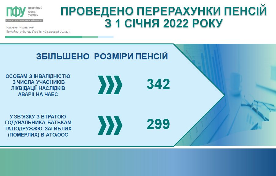 На виконання постанови Кабінету Міністрів України № 1052 від 11.10.2021, якою внесено зміни до постанови Кабінету Міністрів України № 674 від 03.08.2020, Головним управлінням Пенсійного фонду України у Львівській області з 01 січня 2022 року проведено перерахунки пенсій у зв’язку з втратою годувальника, призначених відповідно до частини четвертої статті 41 Закону України “Про пенсійне забезпечення осіб, звільнених з військової служби, та деяких інших осіб”.